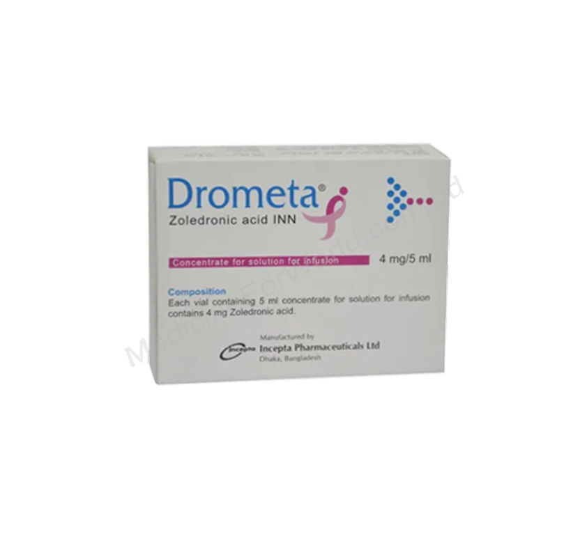 Drometa (Zoledronic Acid) generic Zometa is a prescription medicine used to treat high blood calcium levels (hypercalcemia) that may occur with breast cancer, lung cancer, Prostate cancer. Zoledronic acid is also used with cancer chemotherapy to treat multiple myeloma and bone problems. Zoledronic Acid lowers high blood calcium levels by reducing the amount of calcium released from your bones into your blood. Zoledronic acid also works for Hypercalcemia of malignancy and slowing the breakdown of your bones by cancer to prevent bone fractures. Drometa is manufactured by Incepta Pharma Ltd. in Bangladesh.