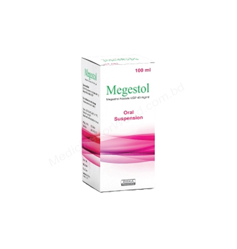 Megestol Suspension (Megestrol acetate), generic Megace is a prescription medicine used to treat of certain hormone dependent neoplasms, such as breast cancer. Megestrol acetate is a progestational agent. Megestrol acetate is also indicated in male or female patients for the treatment of anorexia, cachexia or weight loss secondary to metastatic cancer. By enhancing appetite and weight gain, megestrol acetate may improve your well-being and activity level. Megestrol acetate is a synthetic analogue of progesterone, a natural hormone produced by the body. Megestol Suspension manufacturted by Ziska Pharmaceuticals Ltd. in Bangladesh.